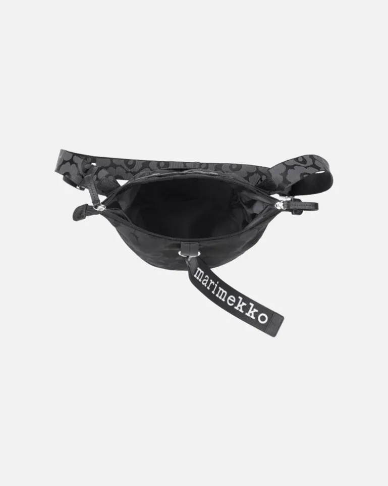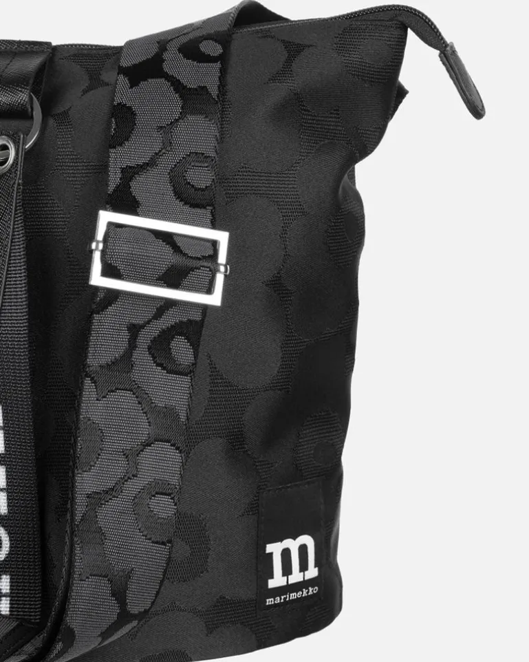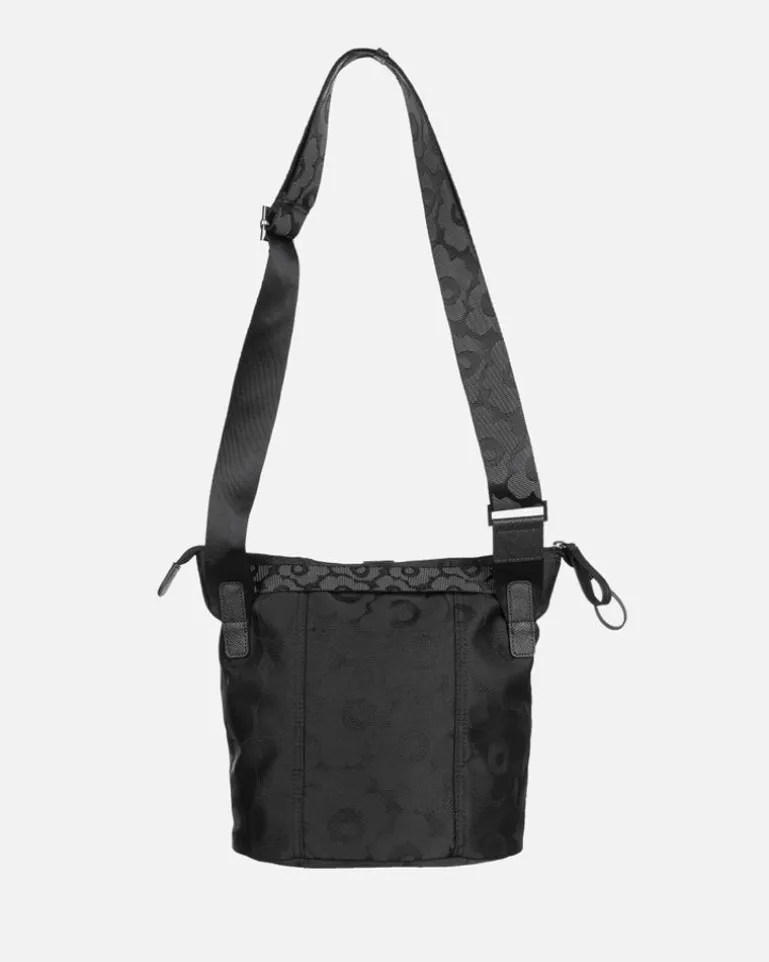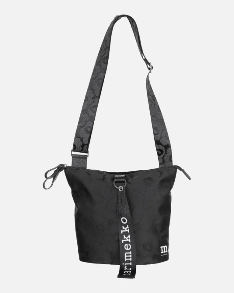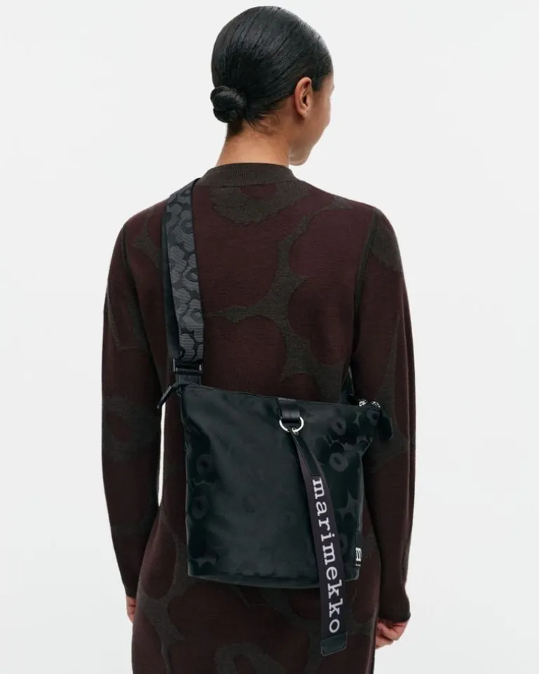 The Bag Has A Zipper Closure, A Handle, And An Adjustable, Jacquard Knit Unikko Pattern Shoulder Strap, Which Is Made Of Recycled Polyamide. There Is An Open Pocket On The Inside And An Open Pocket On The Outside. The Marimekko Keychain Is Attached To The Front. The Bag Has Leather Details.
