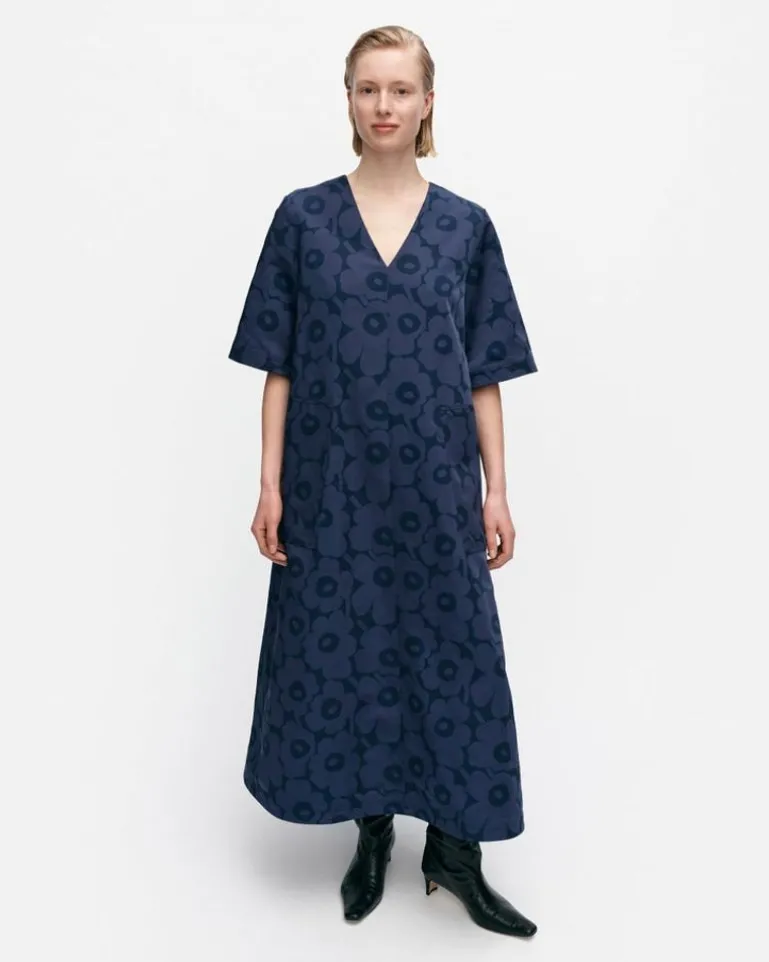 The Edelle Dress Is Made Of Firm Recycled Polyester And It Has A Slim, A-Line Fit. The Dress Features The Jacquard Knit Mini Unikko Pattern, A Deep V-Neck, Loose Elbow-Length Sleeves, And Large Patch Pockets In The Front With Side Openings. The Dress Has Topstitched Seams.