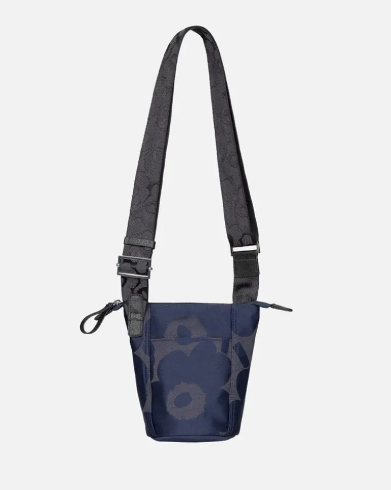 The Essential Bucket Shoulder Bag Is Made Of Recycled Polyester With A Jacquard Knit Unikko Pattern. The Small Bag Has A Zipper Closure And An Adjustable Shoulder Strap. The Front Features The Marimekko Keychain And There Is A Slip-In Pocket In The Back. The Bag Has Leather Details.