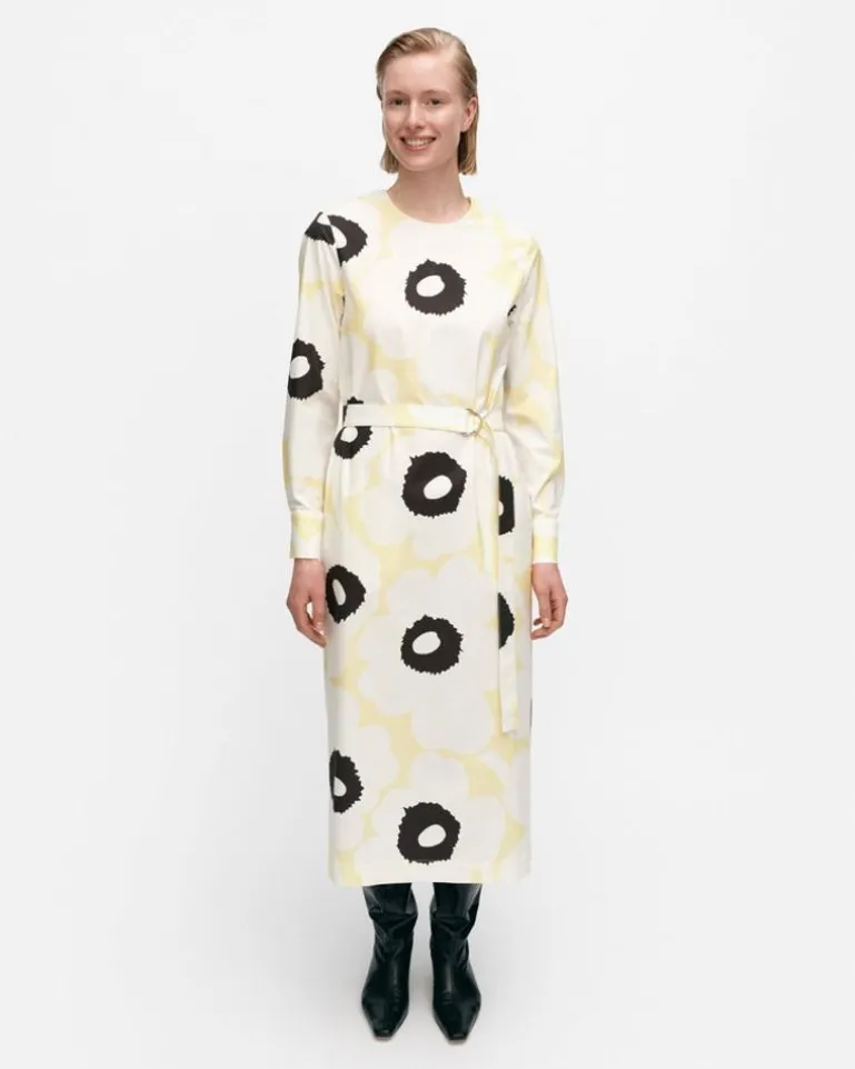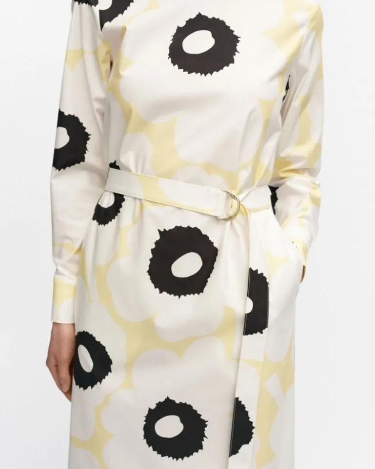 The Hyperbeli Dress Is Made Of Organic Cotton Twill With A Slim, Straight Fit And The Unikko Pattern. The Product Contains 4% Elastane. The Dress Has An O-Neck With A Concealed Zipper In The Back Seam, Side Seam Pockets, And A Wide, Separate D-Ring Belt. The Cuffed Sleeves Have Slits And Button Closures And There Is A Hem Slit At The Back.