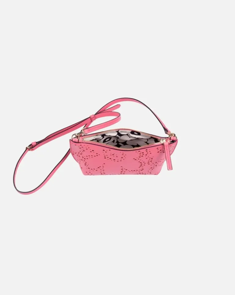 The Imprint Crossbody Shoulder Bag Is Made Of Traceable Scandinavian Leather, And It Features The Perforated Unikko Pattern. The Bag Has A Detachable And Adjustable Shoulder Strap, A Zipper Opening, And A Zipper Pocket On The Inside. The Inside Lining Is Made Of Cotton In The Unikko Pattern.