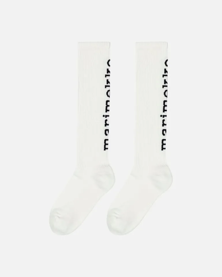 The Suikea Knee High Tennis Socks Are Made Of A Cotton Blend And They Feature The Marimekko Logo Text On The Back Of The Sock Leg.