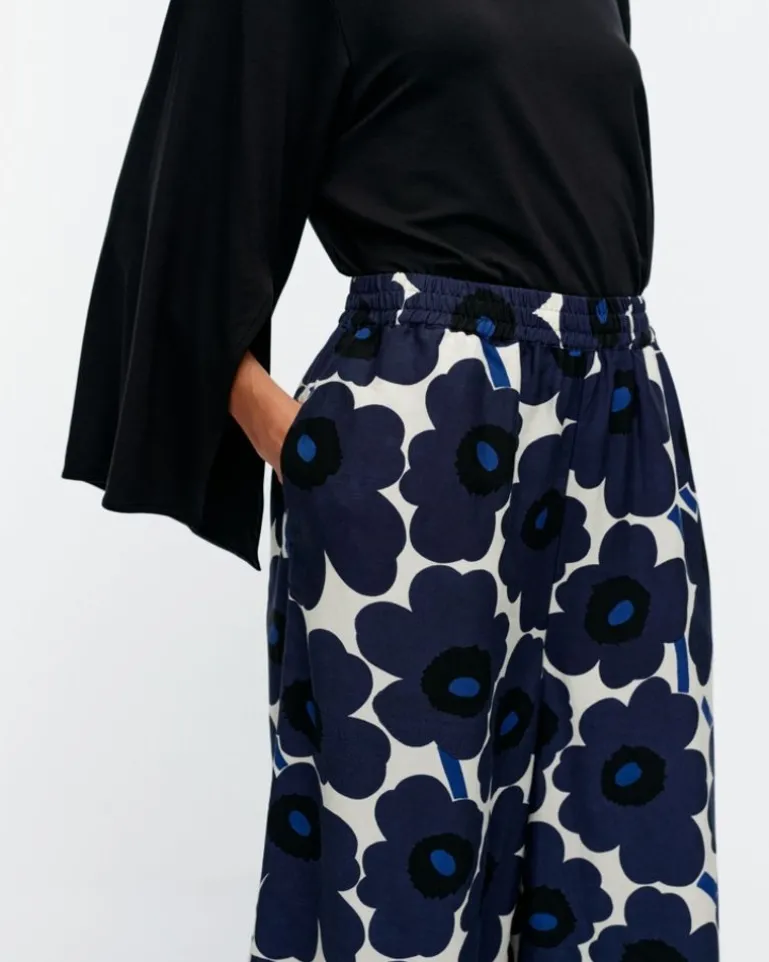The Kuvio Trousers Are Made Of A Cupro And Linen Blend And They Have A Relaxed Fit With Wide, Cropped Trouser Legs. The Trousers Feature The Unikko Pattern, An Elastic Waistband, And Side Seam Pockets.