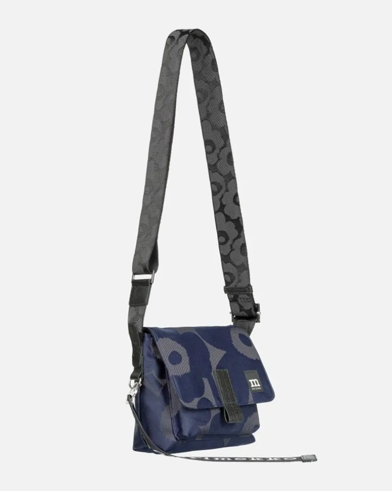 The Unikko Pattern Mini Messenger Shoulder Bag Is Made Of Recycled Jacquard Knit Polyester. The Bag Has One Open Pocket And A Larger Open Compartment Under The Front Flap. The Adjustable Shoulder Strap Has The Jacquard Knit Unikko Pattern. The Bag Features The Marimekko Keychain And Leather Details.