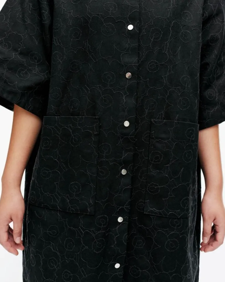 The Mitta Shirt Dress Is Made Of Firm Organic Cotton Canvas, And It Has A Relaxed, Straight Fit. The Dress Features The Stitched Mini Piirto Unikko Pattern. The Dress Has A Pointed Collar, A Snap Button Closure, Loose Elbow-Length Sleeves, And Large Patch Pockets In The Front. There Is A Yoke Seam And Pleats In The Back.