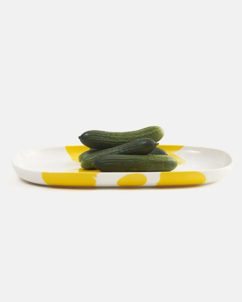 The Rectangular Oiva Serving Dish Is Made Of White Stoneware, And It Features The Iso Unikko Pattern. The Pattern Continues Over The Edge Of The Plate, Down Until The Foot Ring. The Plate Is Dishwasher, Oven, Microwave, And Freezer Safe.
