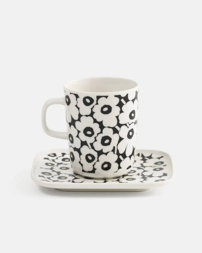 The Oiva Mug Is Made Of White Stoneware, And It Features The Pikkuinen Unikko Pattern. The Mug Is Dishwasher, Oven, Microwave, And Freezer Safe.