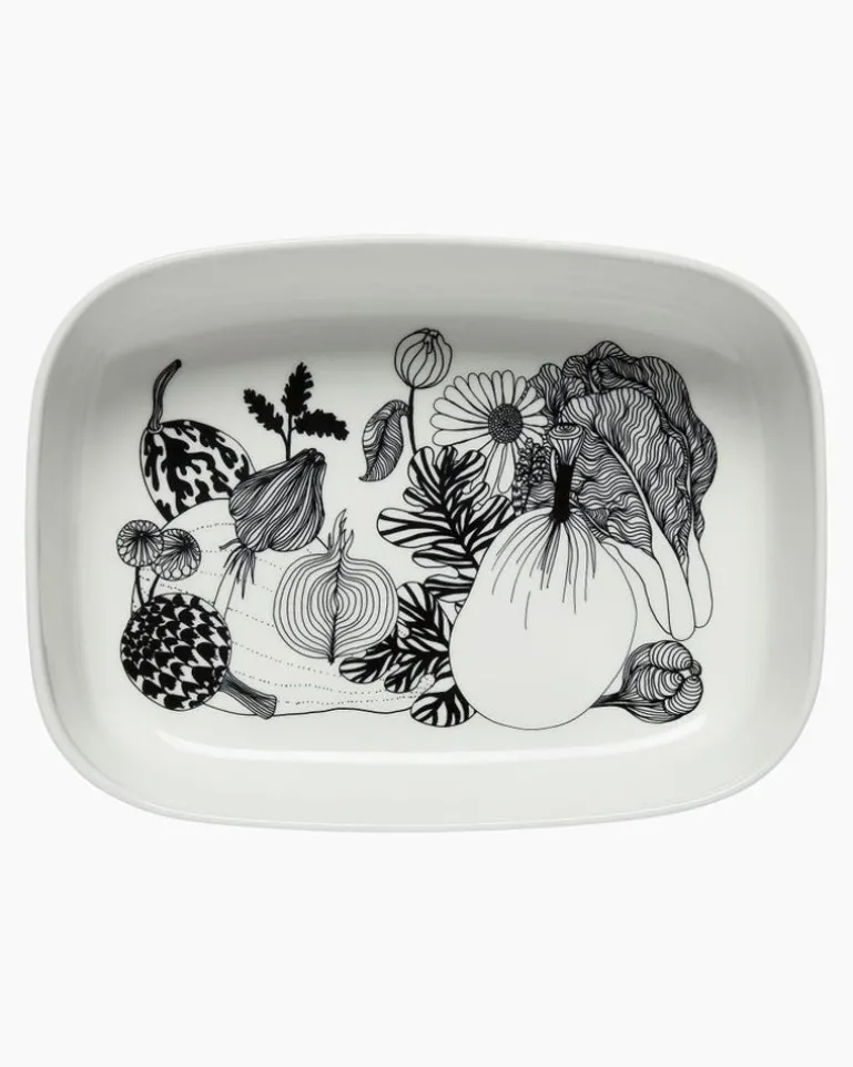 The Oiva Serving Dish Features The Black And White Siirtolapuutarha Pattern On The Inside And It Is Made Of Dishwasher, Oven, Microwave And Freezer Safe White Stoneware.