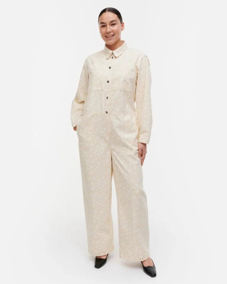 The Papaver Organic Cotton Twill Overall Has A Relaxed, Straight Fit, And It Is Printed In The Unikko Pattern. The Overall Has A Pointed Collar, A Snap Button Closure, Chest Pockets, And Side Seam Pockets. There Is A Yoke Seam In The Back As Well As An Elastic Waistband And Patch Pockets. The Cuffed Sleeves Have Slits And Snap Button Closures.