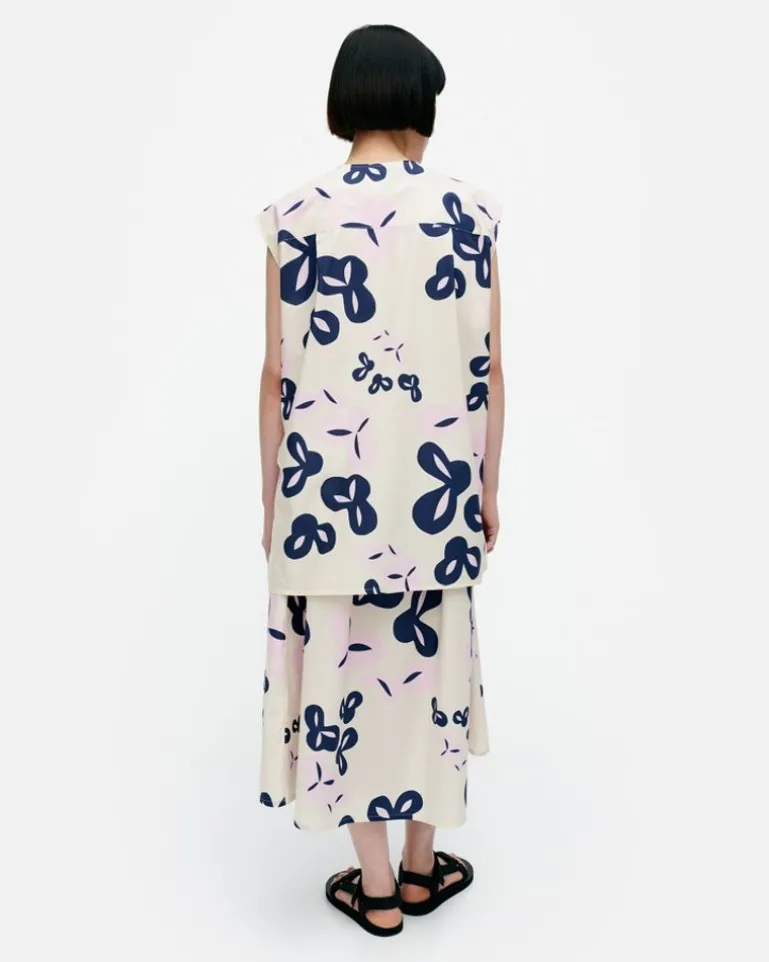 The Pudas Organic Cotton Poplin Tunic Has An Oversized, Straight Fit, And It Features The Poiminto Pattern, Which Is Printed In Helsinki. The Tunic Has An O-Neck, Small Cap Sleeves, And A Button Closure In The Front. There Is A Yoke Seam With Pleats In The Back And The Tunic Has Side Slits At The Hem.