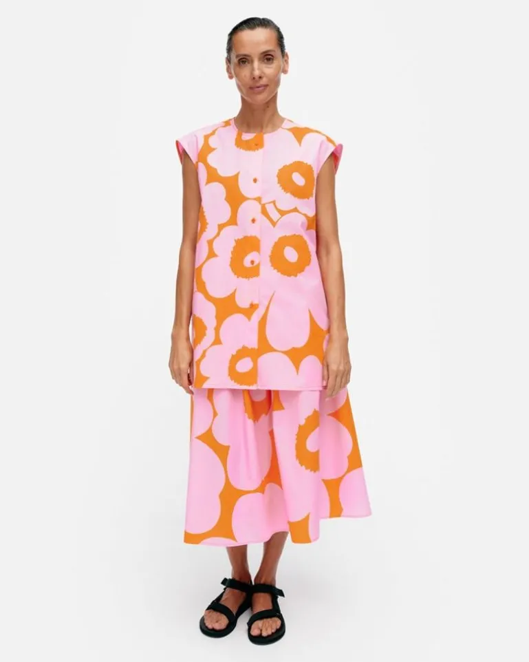 The Pudas Organic Cotton Poplin Tunic Has An Oversized, Straight Fit, And It Features The Unikko Pattern, Which Is Printed In Helsinki. The Tunic Has An O-Neck, Small Cap Sleeves, And A Button Closure In The Front. There Is A Yoke Seam With Pleats In The Back And The Tunic Has Side Slits At The Hem.