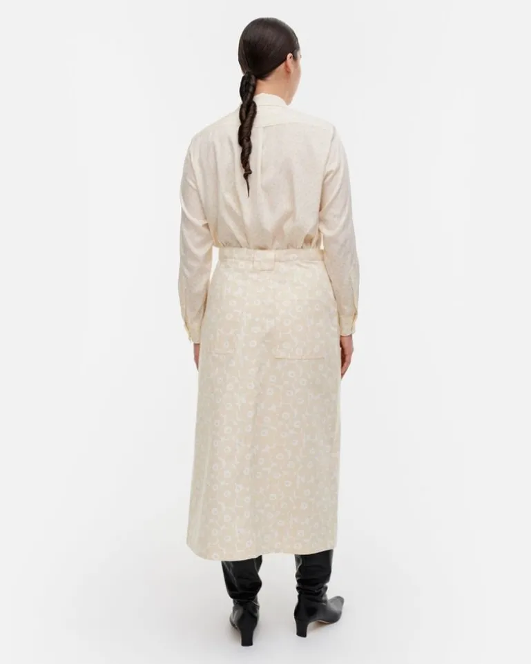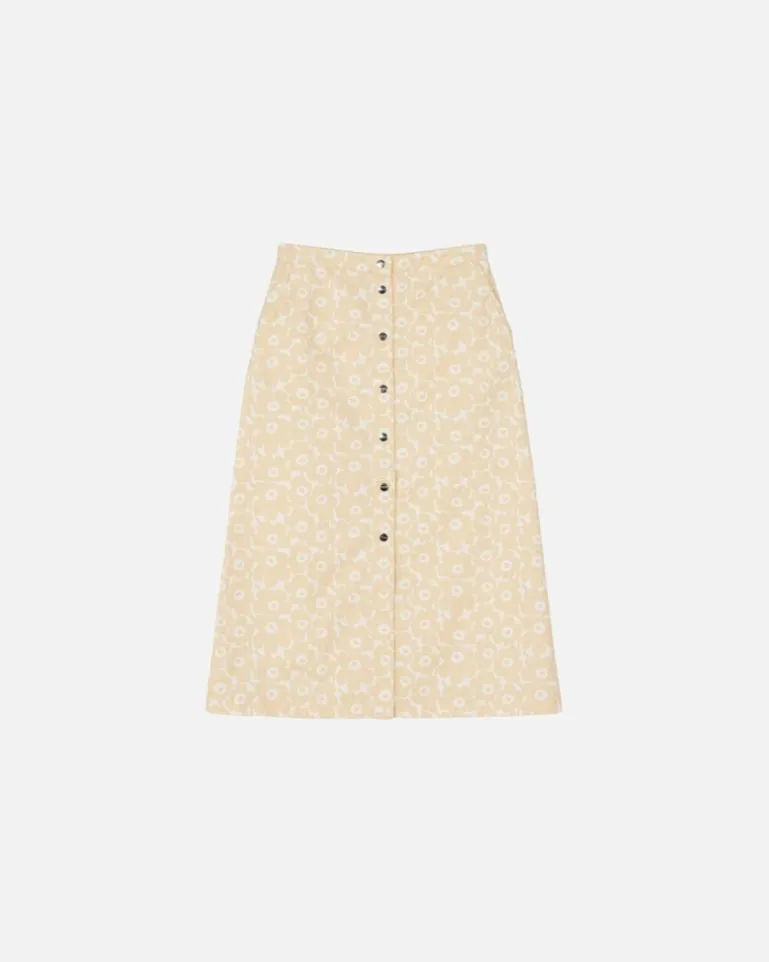 The Puoli Organic Cotton Twill Skirt Has A Slim, Straight Fit And It Is Printed In The Unikko Pattern. The Skirt Has A Waistband With One Wide Belt Loop In The Back, A Snap Button Closure In The Front, Slanted Side Pockets, And Patch Pockets In The Back.