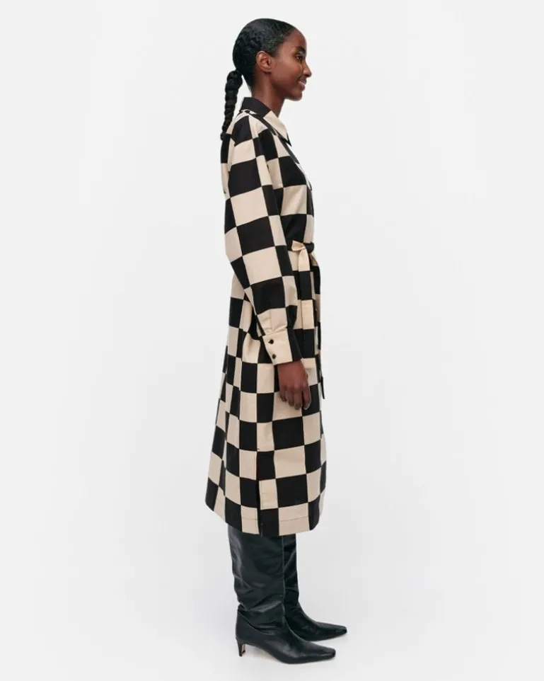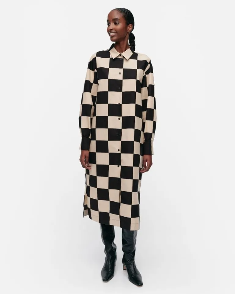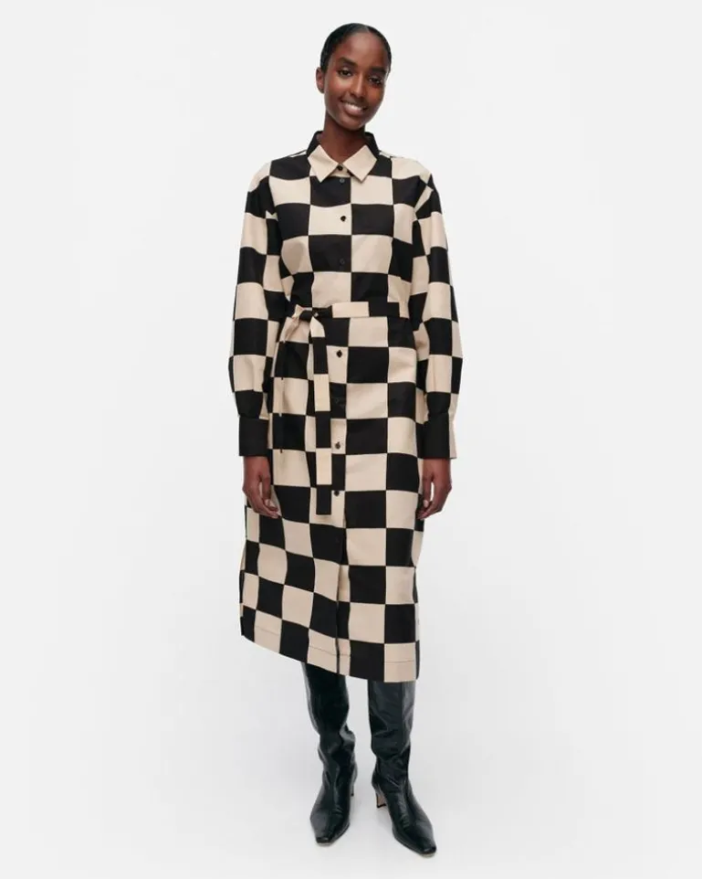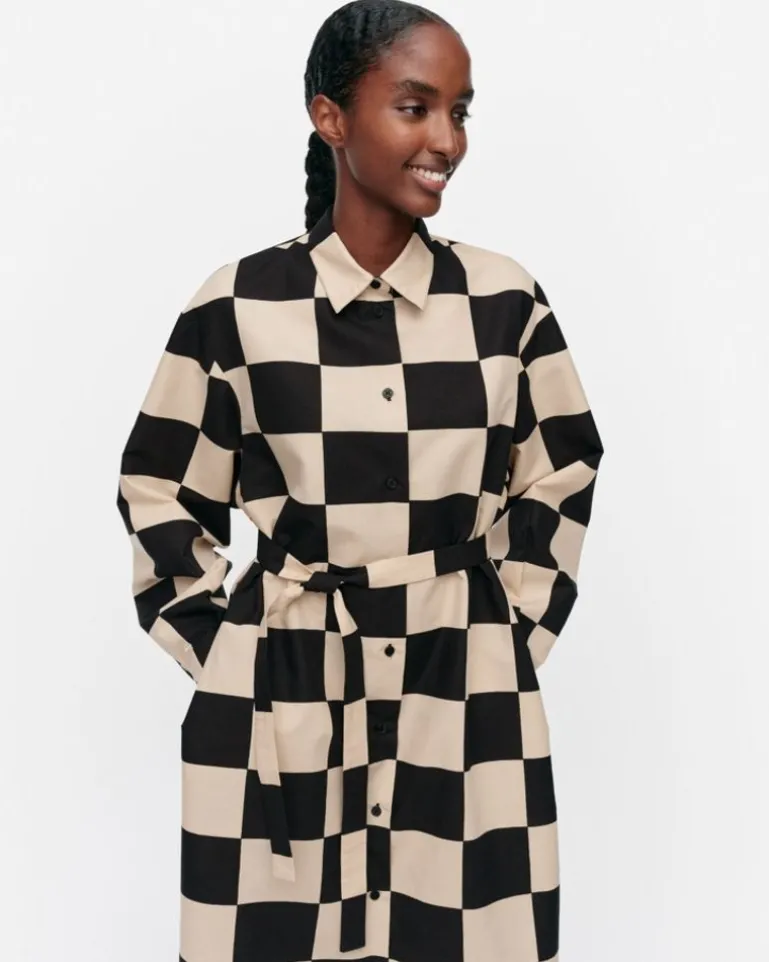 The Rasteri Shirt Dress Is Made Of A Cotton And Linen Blend, And It Has A Relaxed, Straight Fit. The Dress Features The Kukko Ja Kana Pattern, Which Is Printed In Helsinki. The Dress Has A Pointed Collar, A Button Closure, Side Seam Pockets, And Side Slits At The Hem. The Cuffed Sleeves Have Slits And Button Closures. The Dress Has Separate Belt.