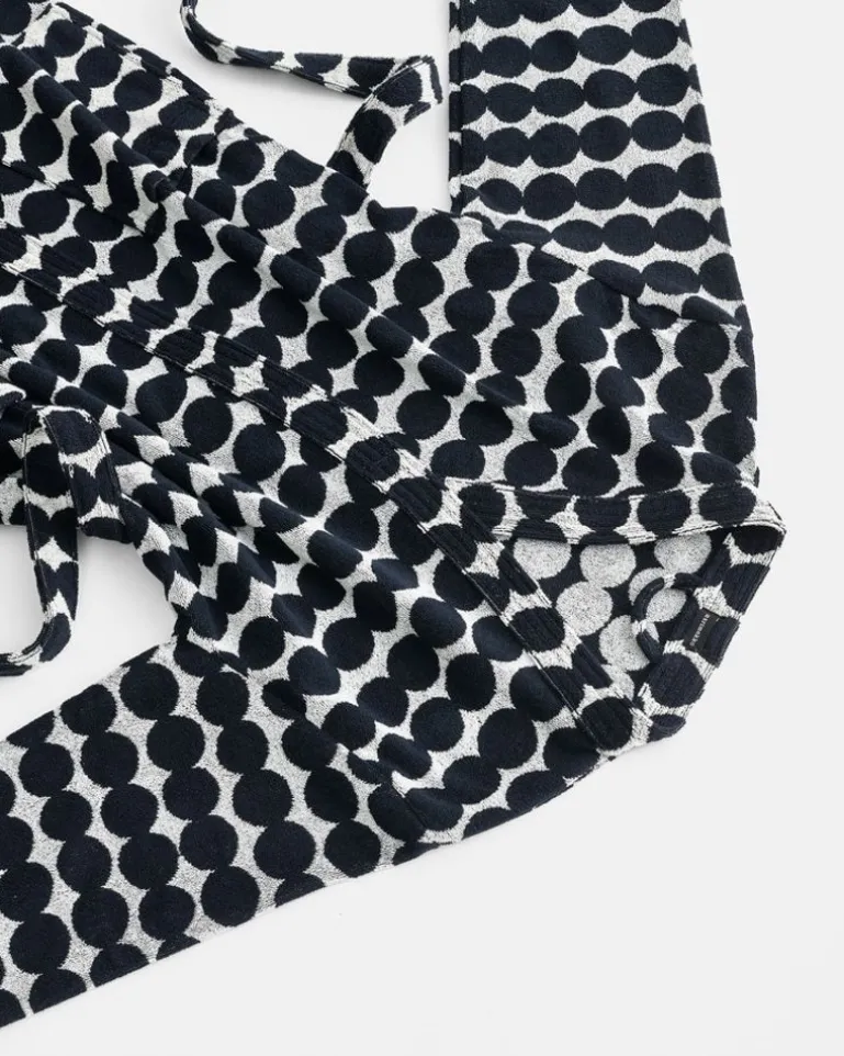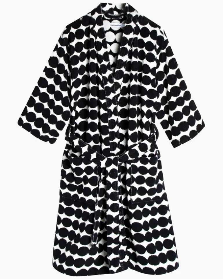 This Thick And Comfy Cotton Terry Bathrobe Is Decorated With A Black And White Räsymatto Pattern. The Robe Has Large Pockets In The Front And A Detachable Belt. The Inside Of The Robe Is A Color Negative Of The Outside, Giving The Robe A Playful Look.