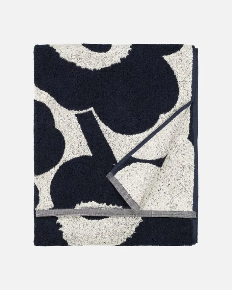 Made From A Cotton And Linen Blend, This Terry Bath Towel Features The Cotton And Dark Blue Coloured Unikko (Poppy) Pattern. The Towel Has Two Different Coloured Sides Because The Dominant Colour On The Reverse Is The Opposite Of The Right Side.