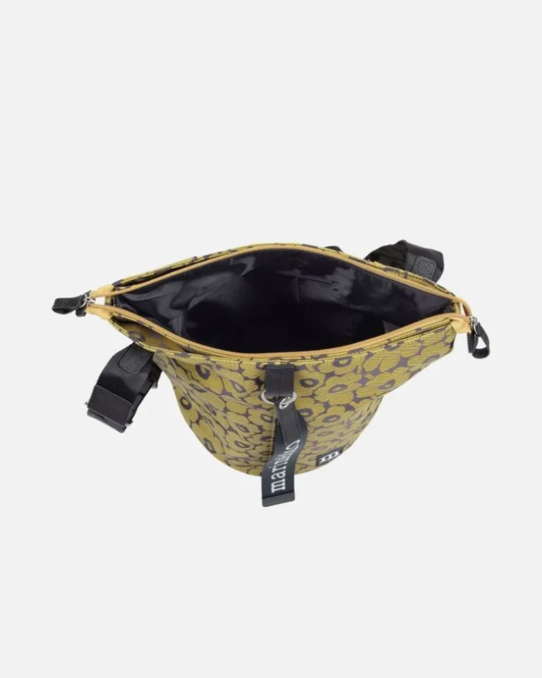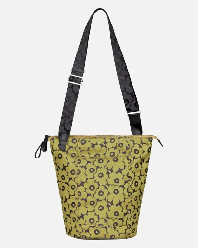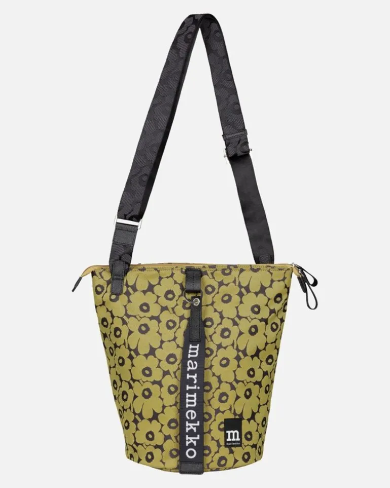 The All Day Bucket Shoulder Bag Is Made Of Recycled Polyester With A Jacquard Knit Unikko Pattern. The Bag Has Three Compartments: One With A Zipper Closure, One Plain Open Compartment, And One Open Compartment With An Inside Pocket. The Shoulder Strap Is Adjustable. The Front Features The Marimekko Keychain And There Is A Slip-In Pocket In The Back, Which Closes With A Magnetic Button. The Bag Has Leather Details.
