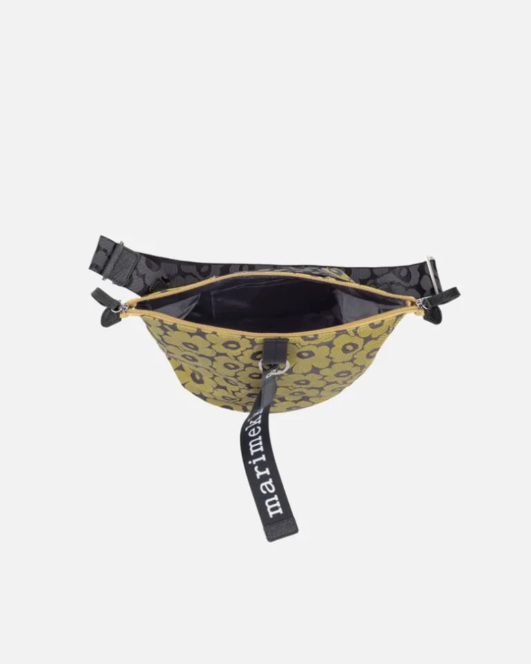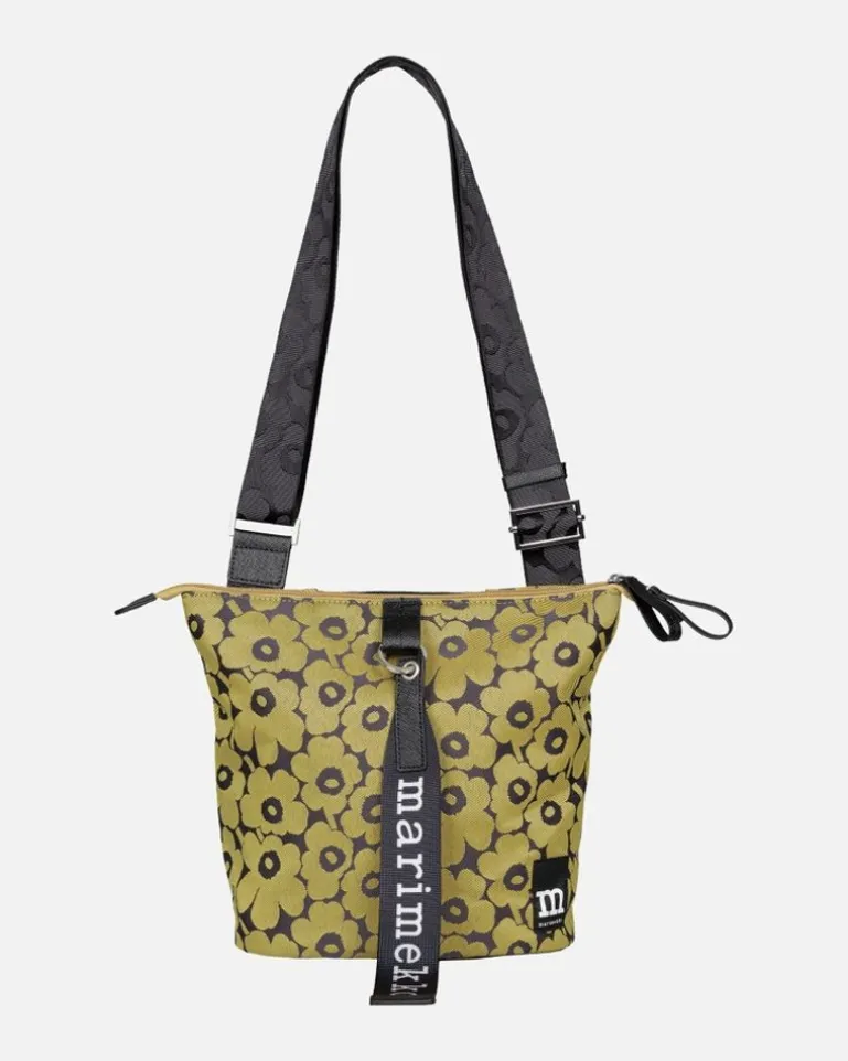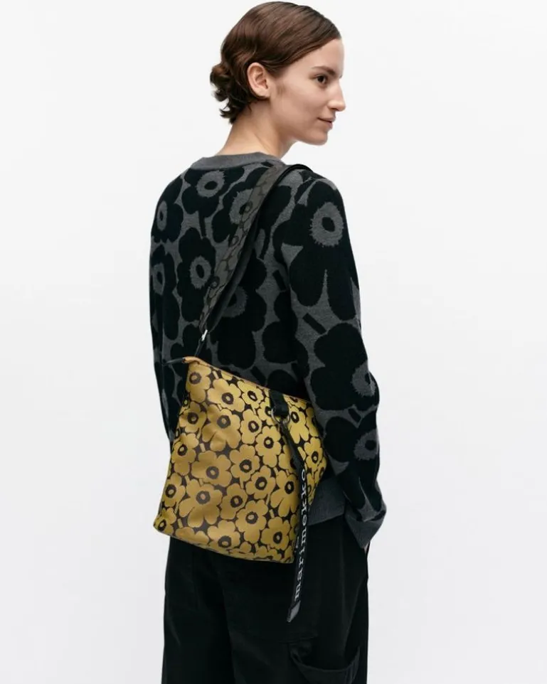 The Carry All Shoulder Bag Is Made Of Recycled Polyester With A Jacquard Knit Unikko Pattern. The Bag Has A Zipper Closure, A Handle, And An Adjustable, Jacquard Knit Unikko Pattern Shoulder Strap, Which Is Made Of Recycled Polyamide. There Is An Open Pocket On The Inside And An Open Pocket On The Outside That Closes With A Magnetic Button. The Marimekko Keychain Is Attached To The Front. The Bag Has Leather Details.