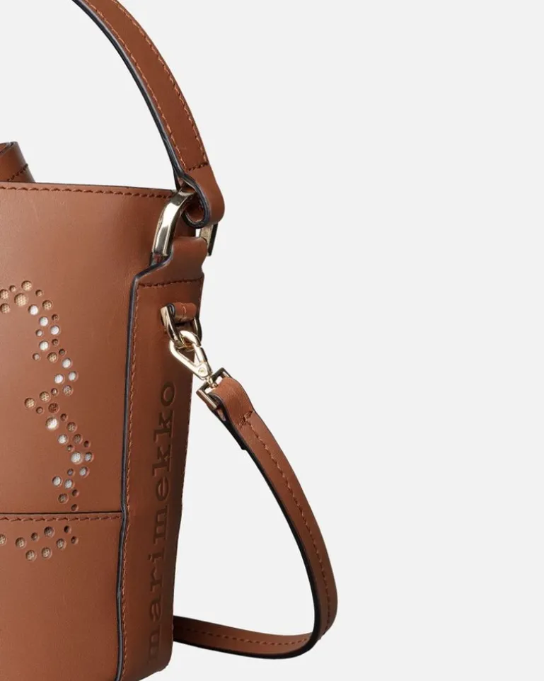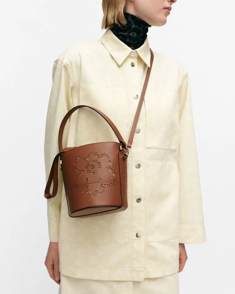 The Imprint Small Bucket Unikko Bag Is Made Of Traceable Scandinavian Leather And It Features The Unikko Flower Perforation In The Front. The Bag Has A Handle Strap And A Detachable And Adjustable Shoulder Strap. The Opening Is Gathered Tight By The Leather Straps And Secured With A Stopper. There Is A Small Slip-In Pocket On The Inside. The Inside Lining Is Made Of Cotton In The Unikko Pattern. The Marimekko Logo Is Debossed On The Sides And Bottom Of The Bag.