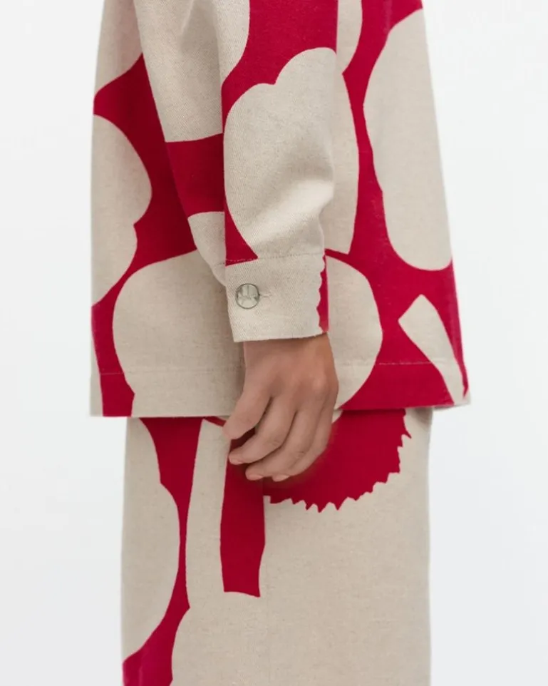 The Kulmat Overshirt Is Made Of A Cotton And Linen Blend Twill And It Has A Relaxed, Straight Fit. The Overshirt Features The Unikko Pattern, Which Is Printed In Helsinki, And It Has A Pointed Collar, A Jean Button Closure, And One Chest Pocket. The Sleeve Cuffs Have Buttons, And They Are Adjustable.