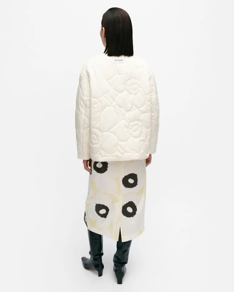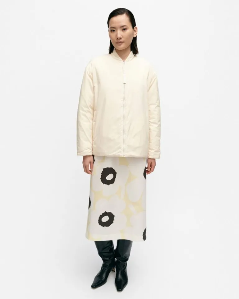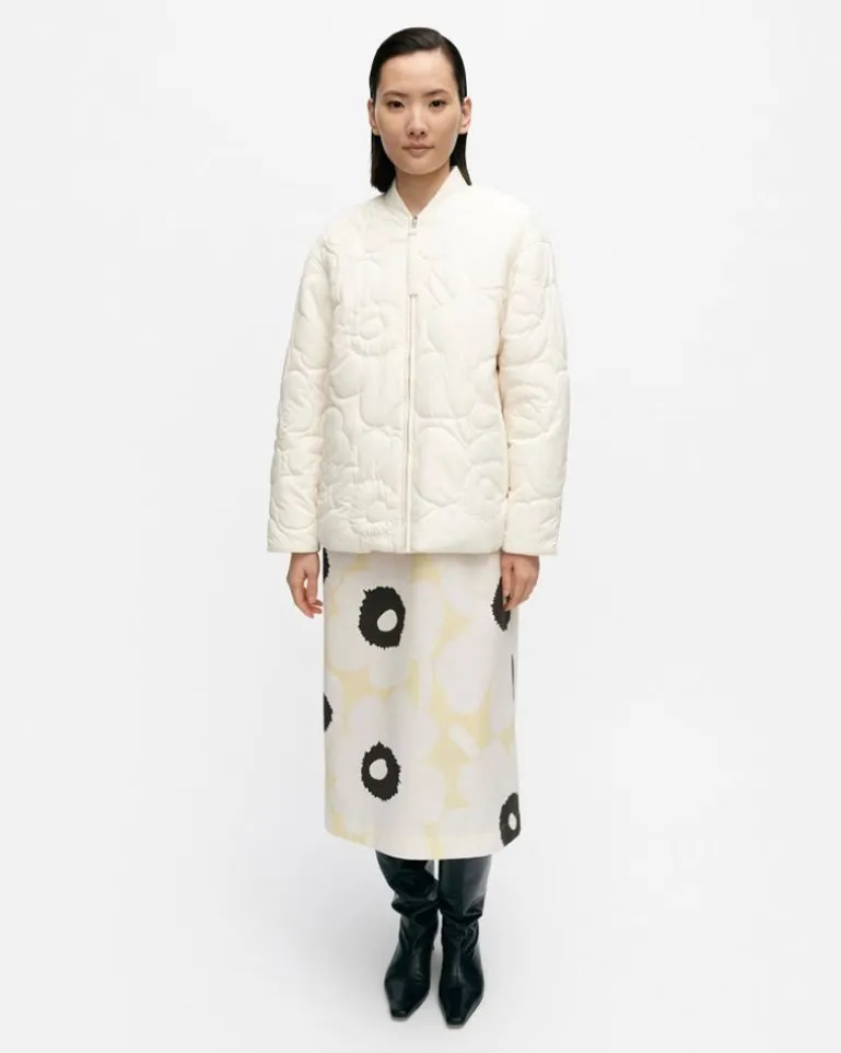 The Kuori Lightweight Padded Coat Is Made Of Recycled Polyester, And It Has A Relaxed, Straight Fit. The Reversible Coat Has The Quilted Unikko Pattern On One Side And An Even, Unquilted Side On The Other. The Coat Has A Band Collar, A Metal Zipper, And List Pockets. The Marimekko Label Is Sewn Onto The Back Neckline On Both Sides.