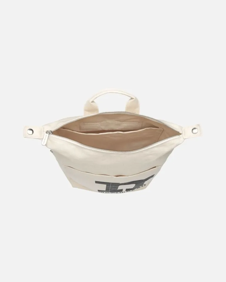 The Mono Backpack Is Made Of Unbleached Organic Cotton. The Backpack Has A Zipper Closure, Adjustable Shoulder Straps, And Two Open Pockets On The Front. There Is A Large Open Pocket On The Inside Big Enough To Fit A Laptop. The Ends Of The Zipper Can Be Attached To The Sides Of The Bag With Snap Buttons.