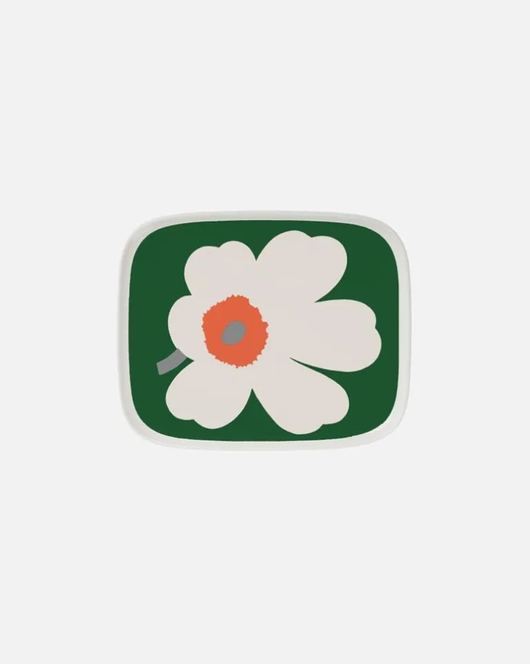The Small Rectangular Oiva Plate Is Made Of White Stoneware, And It Features The Unikko Pattern. The Plate Is Dishwasher, Oven, Microwave, And Freezer Safe.